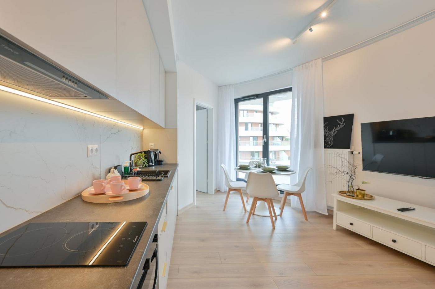 Oferta apartamentu obejmuje sypialnię (1), salon, aneks kuchenny z pełnym wyposażeniem, w tym lodówką i ekspresem do kawy, a także łazienkę (1) z prysznicem oraz bezpłatnym zestawem kosmetyków. W apartamencie zapewniono ręczniki i pościel.
